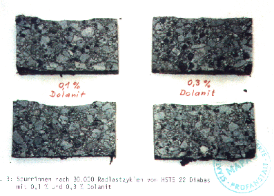 沒有使用德蘭尼特AS纖維的試件經(jīng)過30000次輪載實(shí)驗(yàn)產(chǎn)生嚴(yán)重車轍