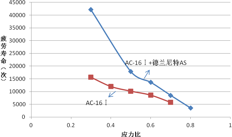 ?????? 圖? 疲勞壽命(次)對(duì)比曲線-添加德蘭尼特AS纖維的瀝青混凝土抗疲勞性提高優(yōu)于木質(zhì)素纖維。